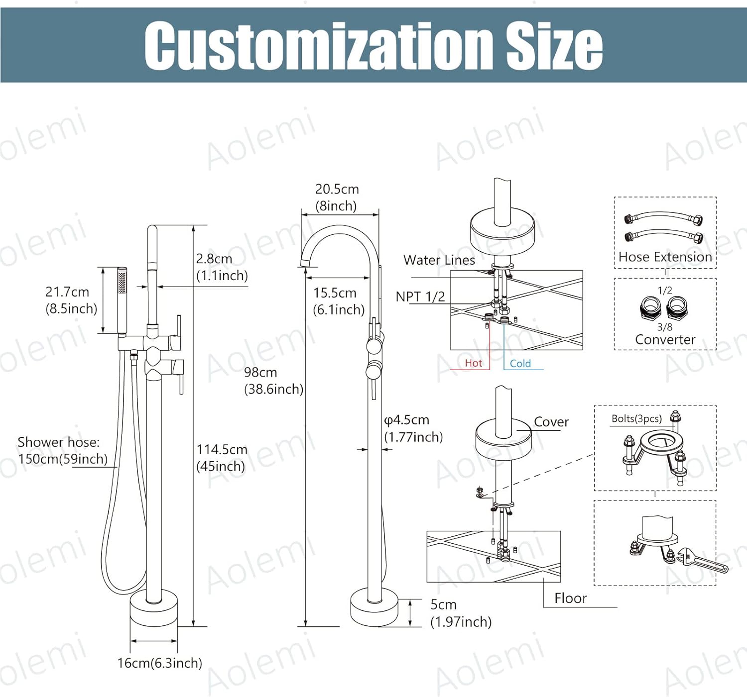 Aolemi Floor Mount Bathtub Faucet Freestanding Tub Filler Standing High Flow Shower Faucets Shower Mixer Taps, Swivel Gooseneck Spout with Cylinder Handheld Matte Black