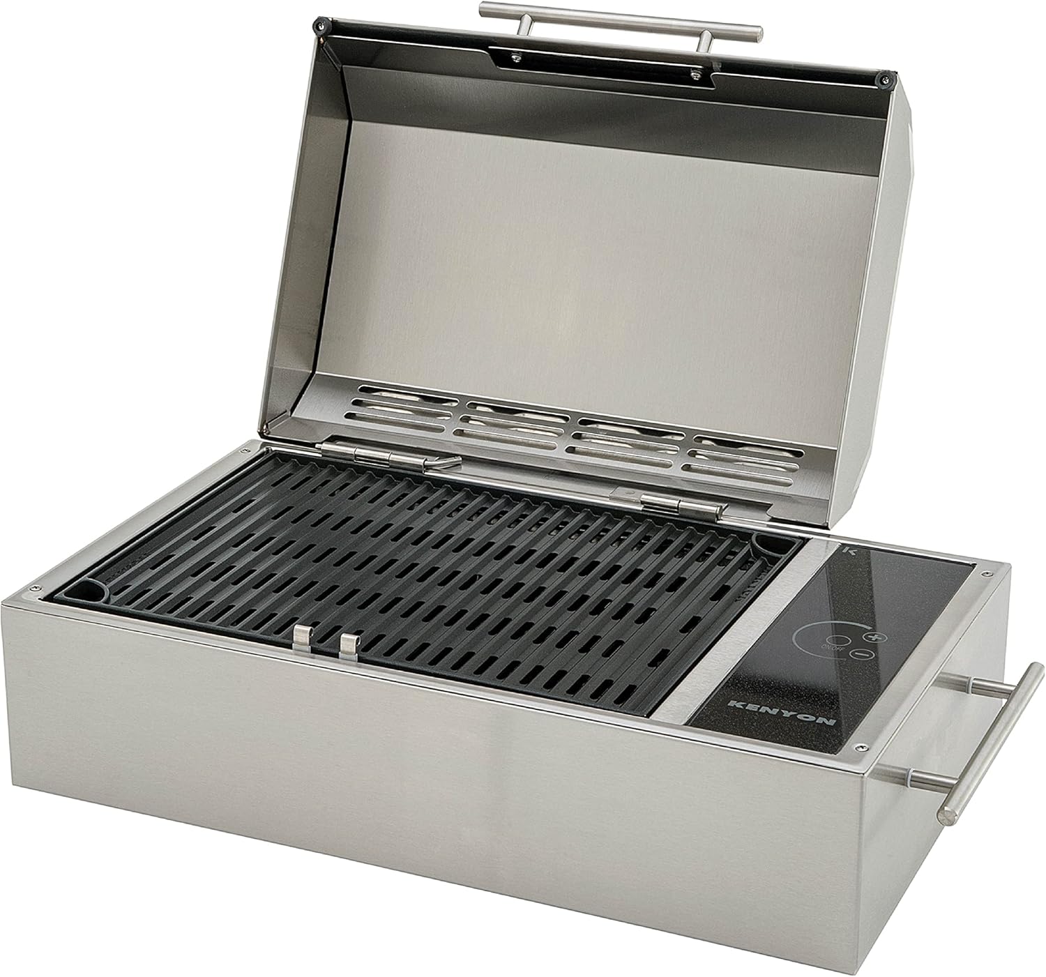 Kenyon B70090 Frontier portable electric grill seals in flavor and juices without the fuss of charcoal or propane. It provides a safe method of grilling without the hazard of open flames and lets you enjoy the fun of grilling your favorite food in the comfort of your home. There is a 1300W element in direct contact with the cooking surface. It lets you get more than 550-degree temperature in 7 minutes. This tabletop grill is designed for places where gas or charcoal grill options are not viable. Made of high-quality marine-grade stainless steel with waterproof digital touch control, this portable electric power grill comes with a rust-proof guarantee for life and is a great addition to any cooking arsenal. The built-in safety shut off timer will turn the grill off after 60 or 90 minutes, depending on the heat setting. This timer is reset with any adjustment to the temperature so it will only turn off if the grill is left inactive. The concealed element of this UL-approved portable grill almost eliminates all smoke while you prepare your food. Using it indoors is as safe as balconies or patios or anywhere outside. Cleaning is super easy. The insulated lid of this portable electric grill prevents accidental burns. It is also removable for quick cleanup. The grilling surface is double-coated, non-stick, and is also dishwasher safe. You can get them extra clean for those baked-on messes.